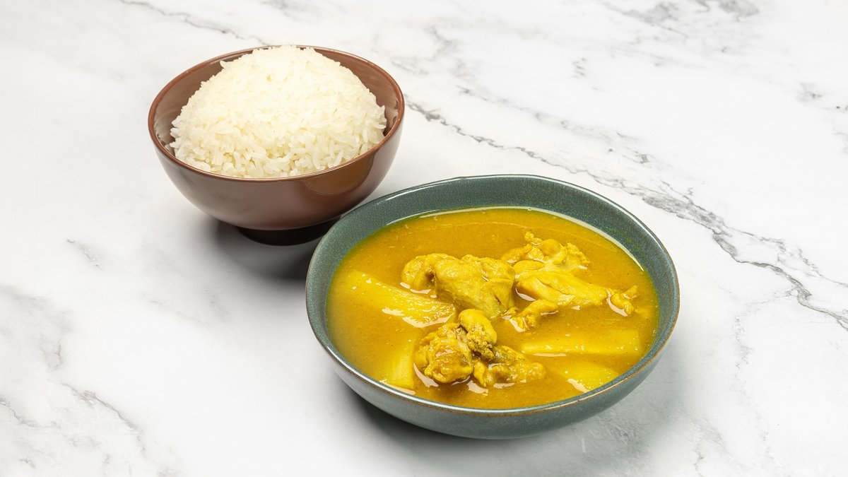 Smagfuld karry med saftige kyllingestykker af kyllingelår og bambusskiver i karrysauce. Serveres med ris.