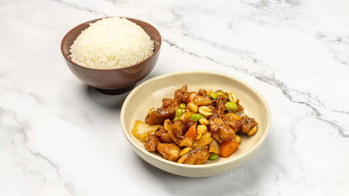 Wokstegte kyllingestykker med peanuts, gulerødder, edamamebønner, løg og hoisinsauce. Serveres med ris.