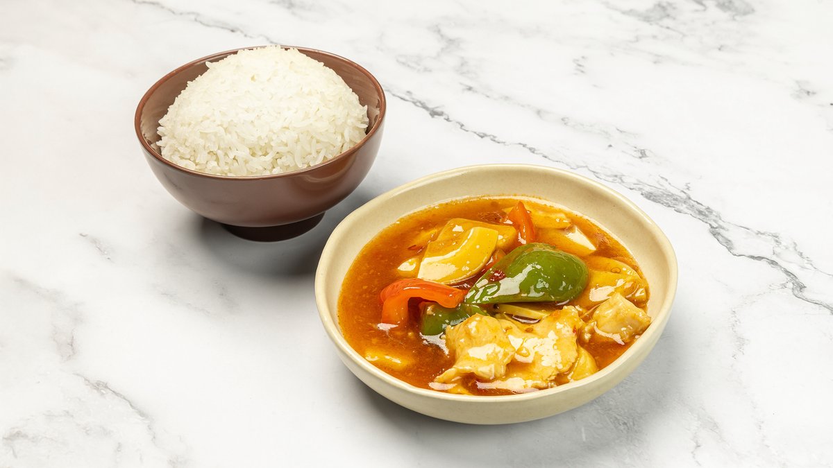 Mørt skåret kylling i en spicy sauce med vinterbambus og peberfrugt. Serveres med ris.