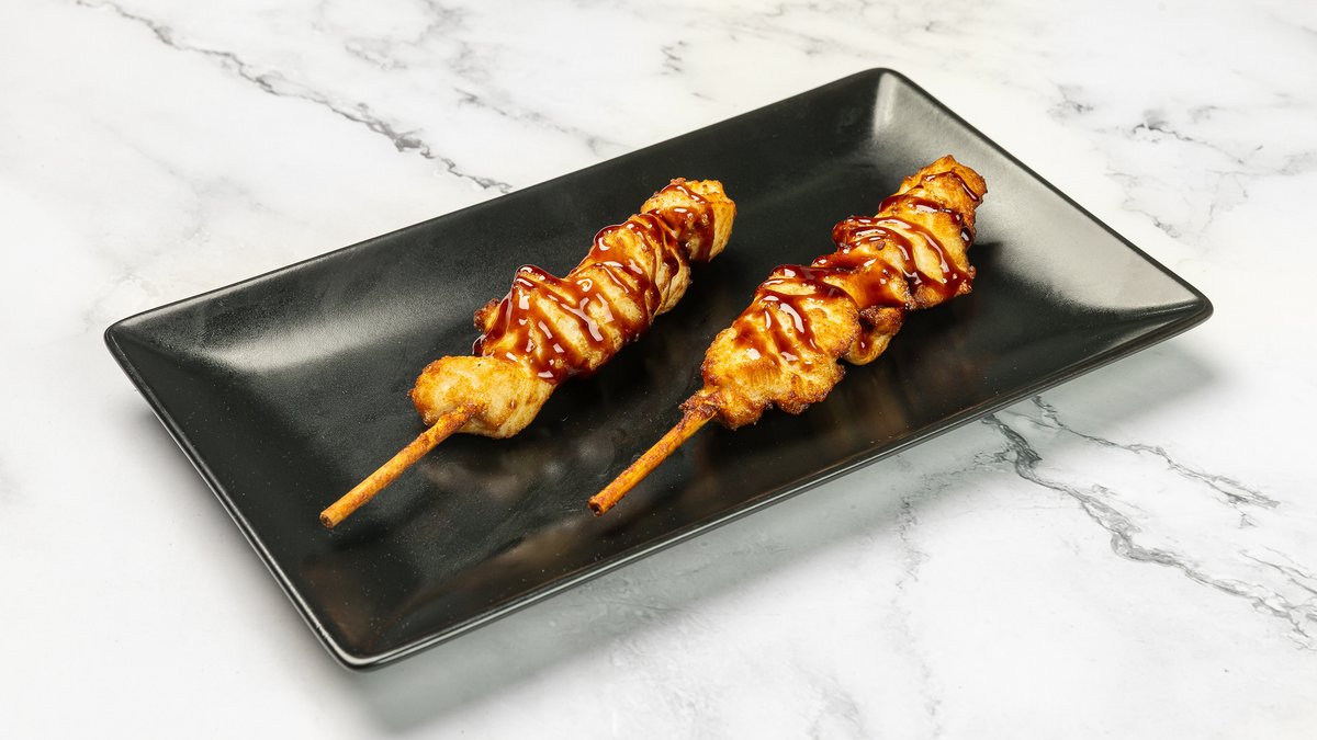 Store, saftige stykker kylling på spyd, toppet med teriyakisauce.