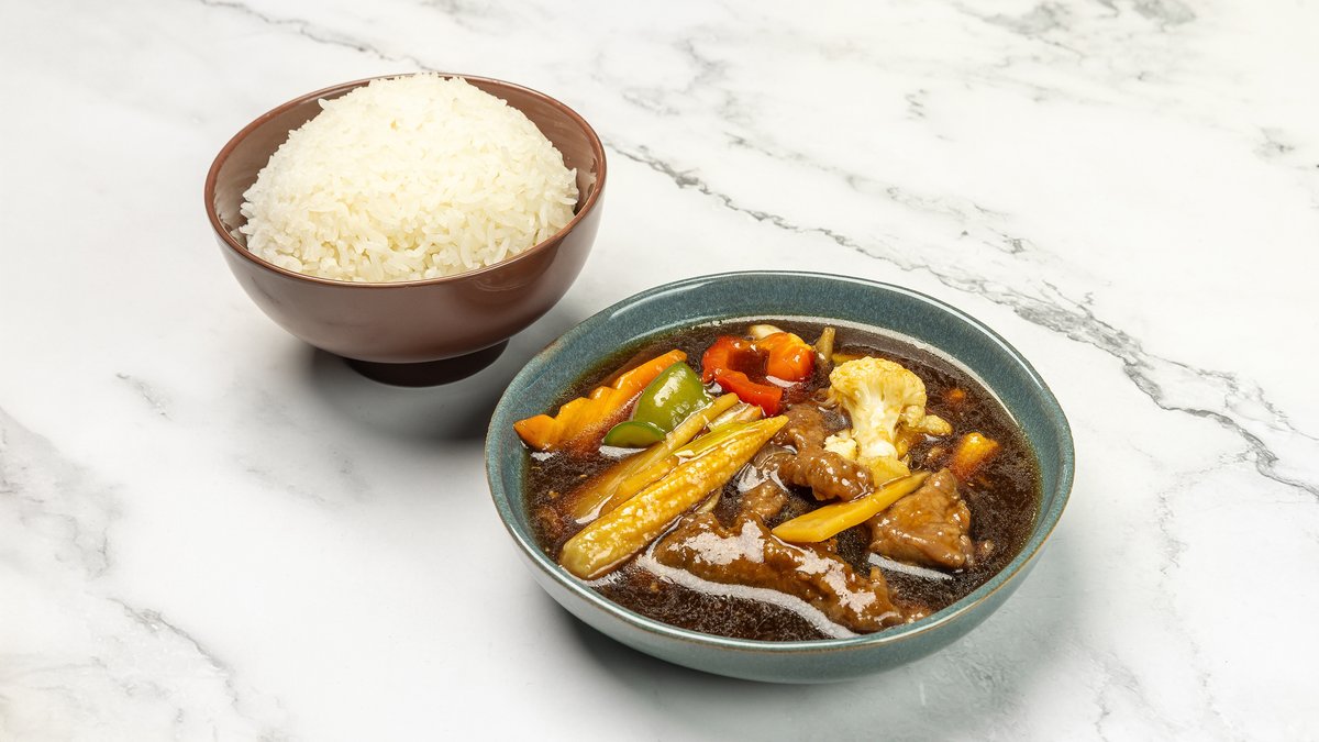 Tyndskåret oksekød i en fyldig, mørk sauce med blandede grøntsager. Serveres med ris.