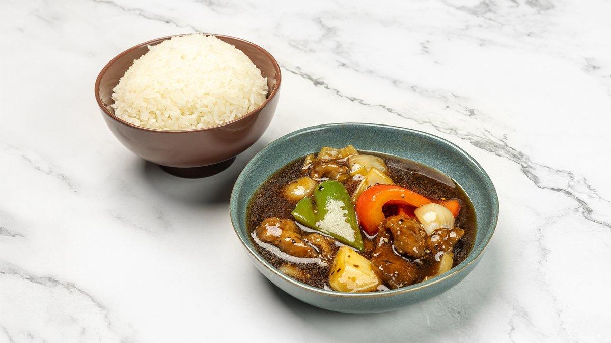 Tyndskåret oksekød i en fyldig, mørk pebersauce med peberfrugt og løg. Serveres med ris.