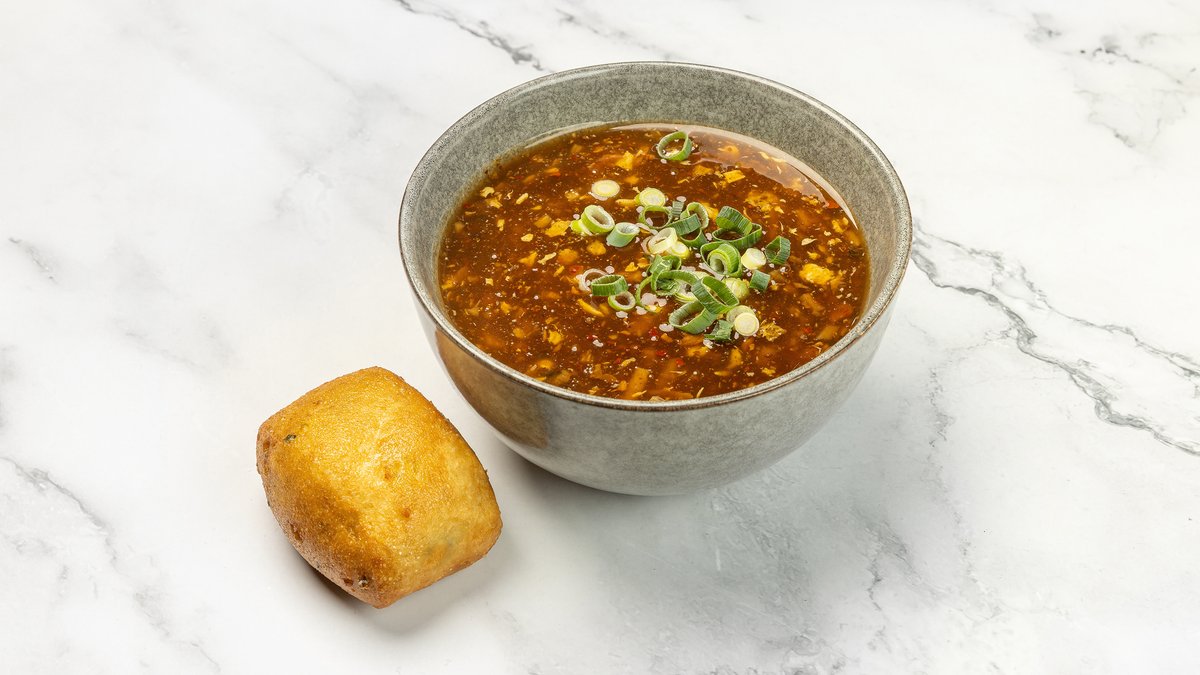 En af Siang Jiangs signaturretter. En traditionel, spicy og smagfuld suppe med hakket svine-, kyllinge- og oksekød, bambus og æg. Serveres med ét stykke Siang Jiangs hjemmelavede bao-brød.
