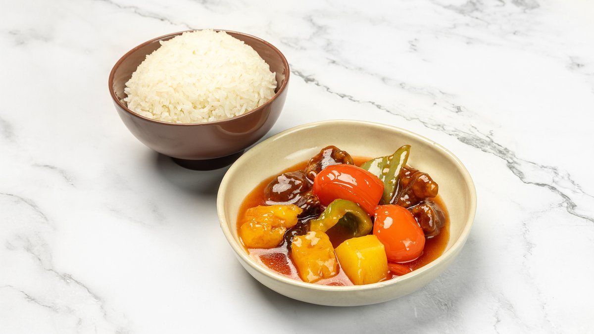 Wokstegt svinemørbrad i sursød sauce med peberfrugt og ananas. Serveres med ris.