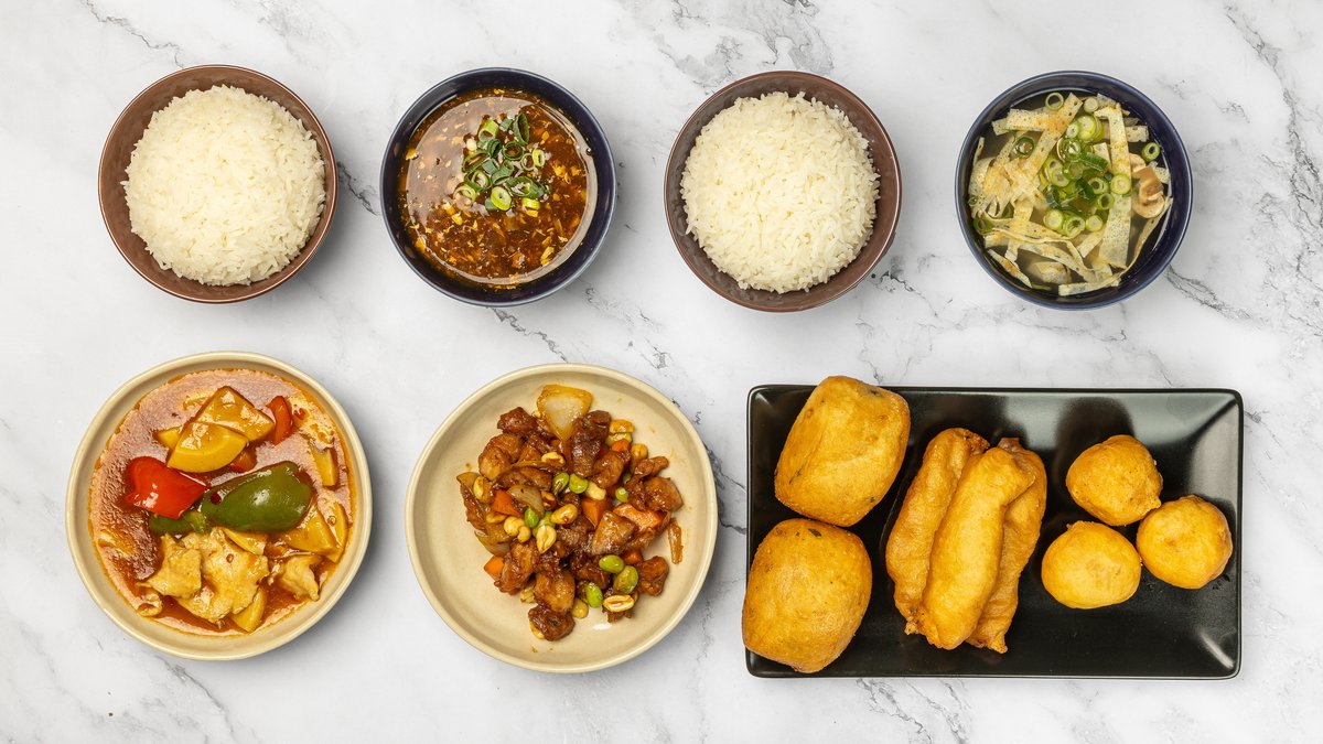 2 x valgfrie forretter serveret med baobrød 2 x valgfrie hovedretter 2 x valgfrie tilbehør Serveres med ris eller stegte nudler.