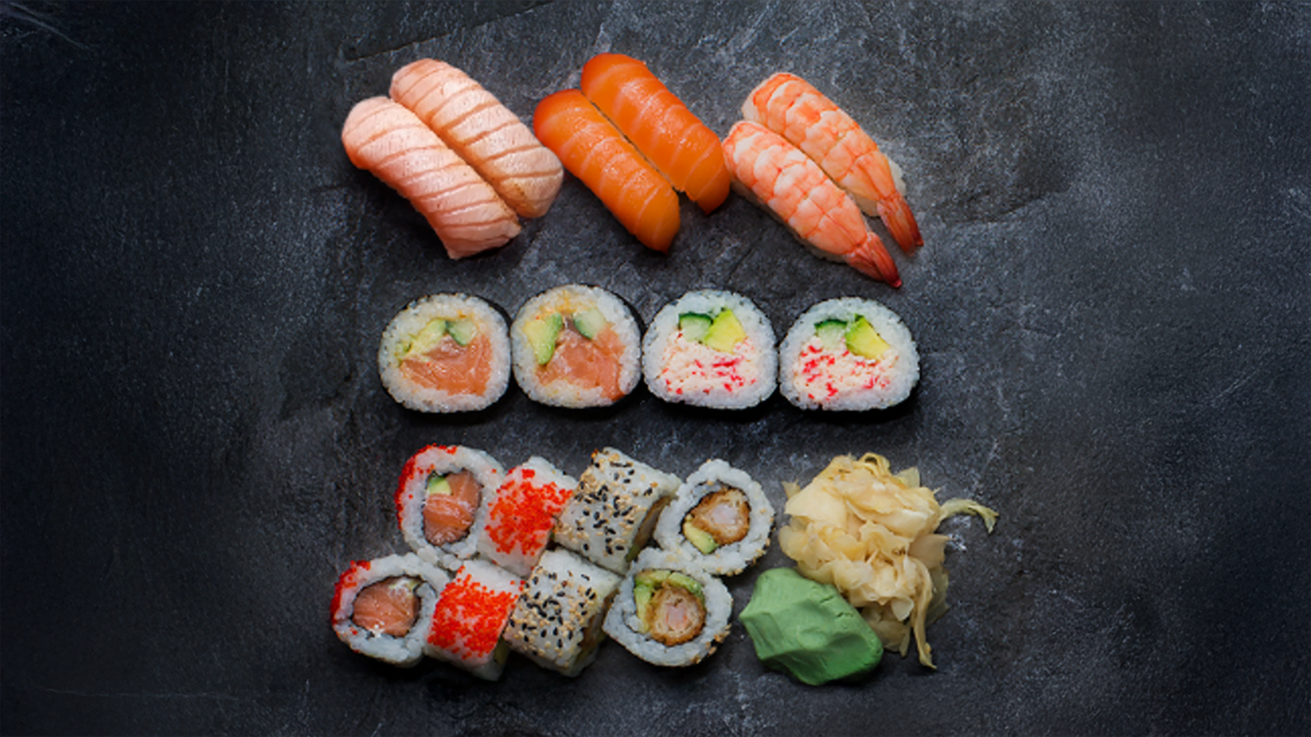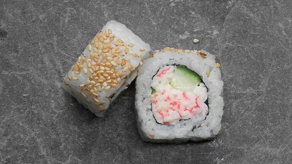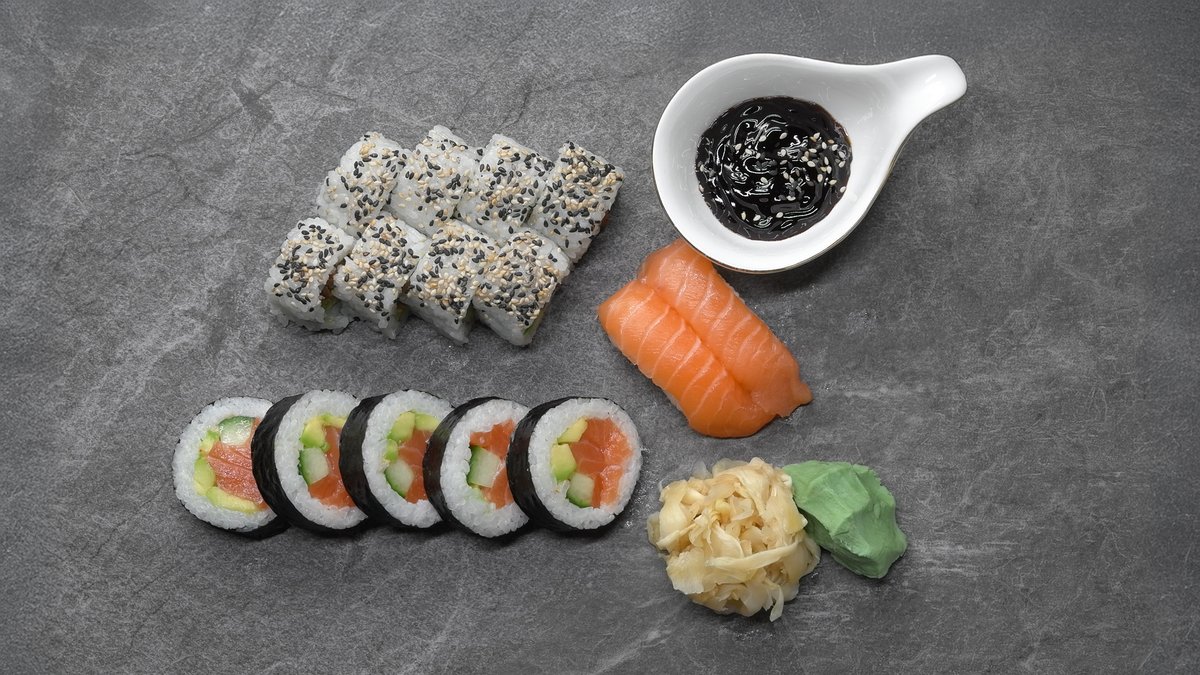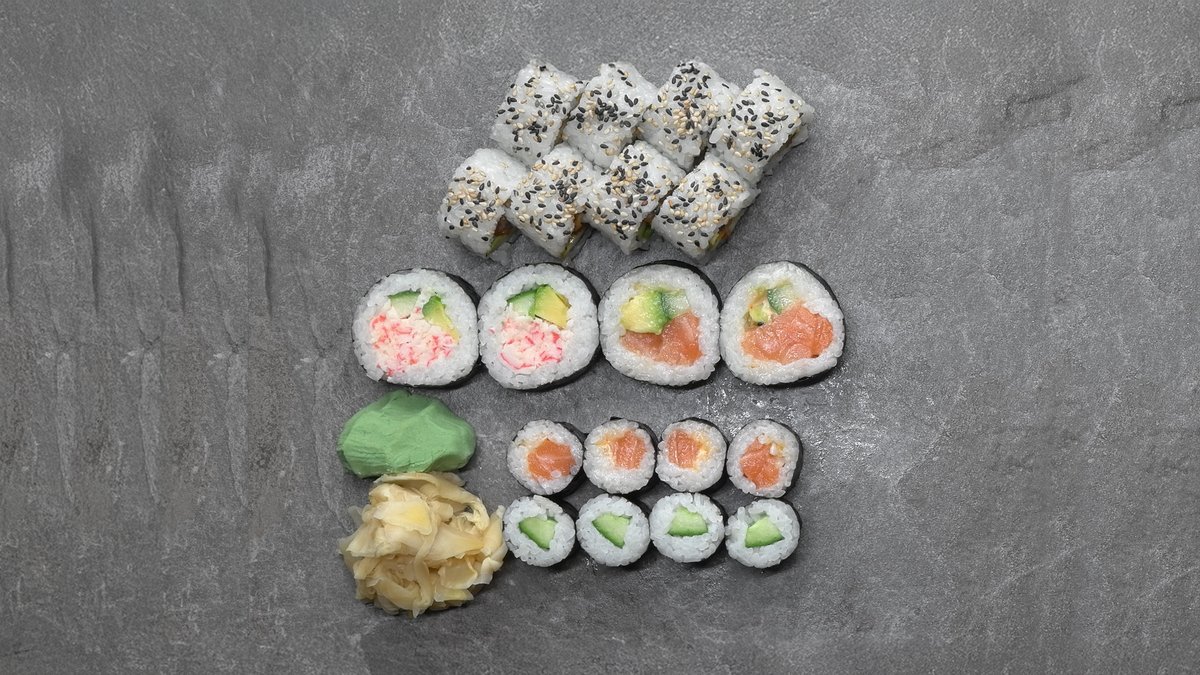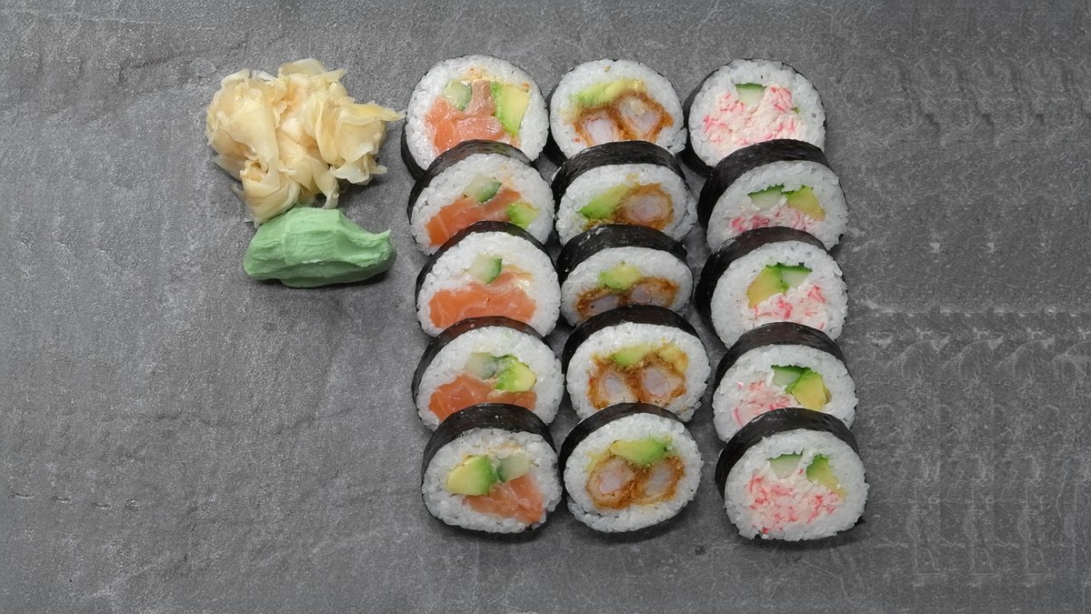 Uramaki: 8 x Crispy Epi Hosomaki: 4 x Spicy laks 4 x Agurk Futomaki: 2 x California 2 x Spicy laks Serveres med soja, syltet ingefær og wasabi.