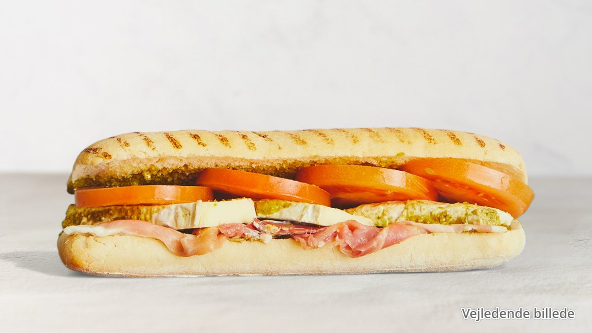 Med fyld af skinke, ost, salat, agurk, tomat, dressing og pesto.