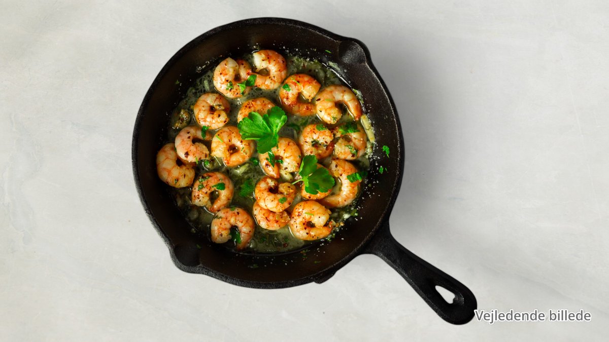 Tomatsauce, ost, muslinger, hvidløg og rejer.