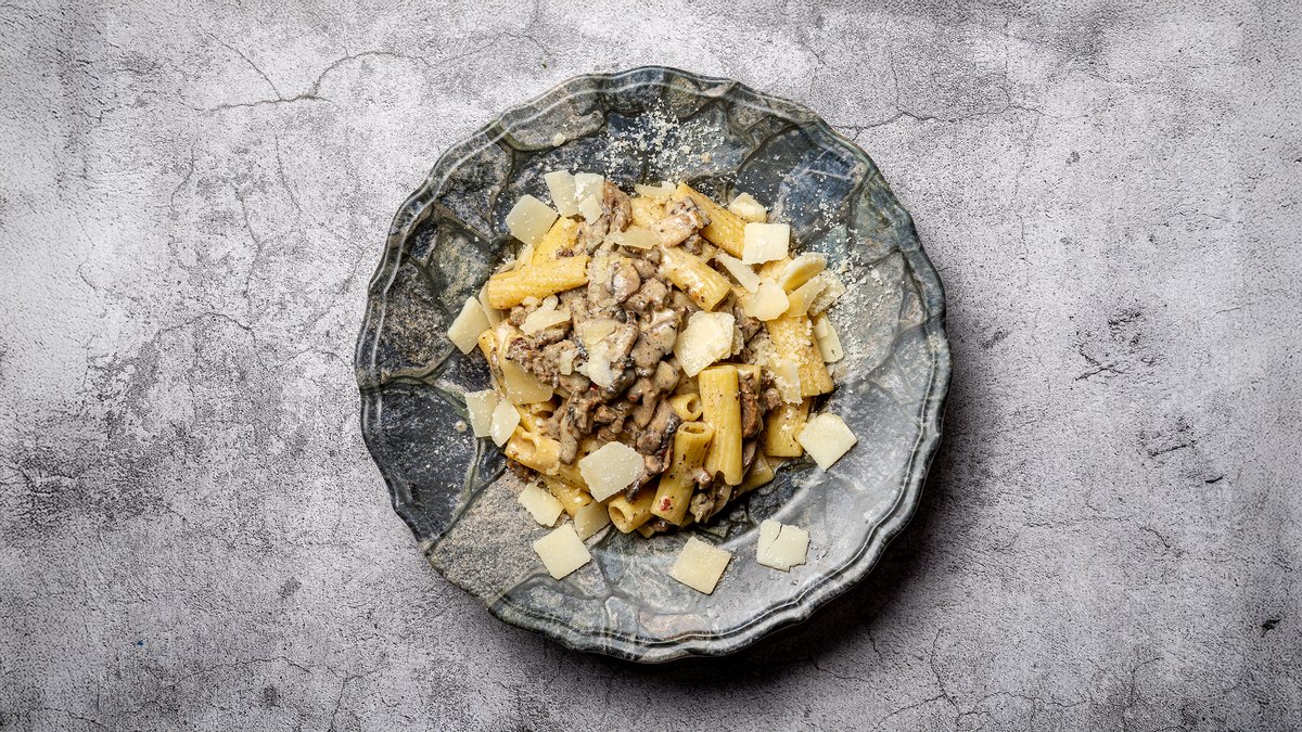 Pasta vendt i tartufo sauce med oksemørbrad, svampe og grana.