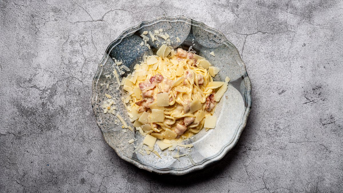 Spaghetti vendt i fløde med pancetta, grana og æg.