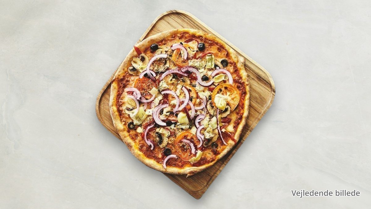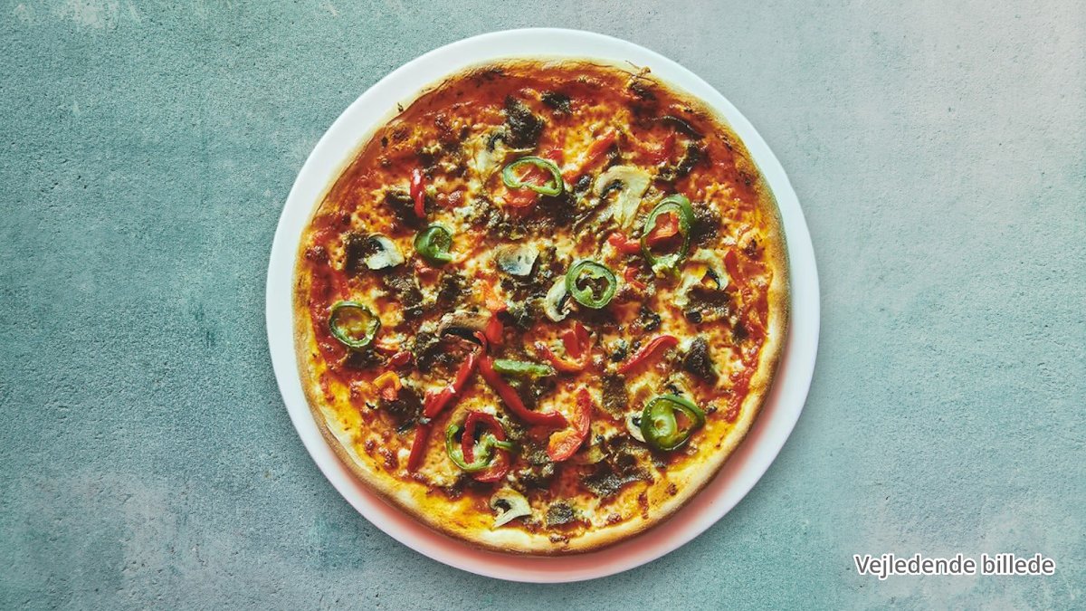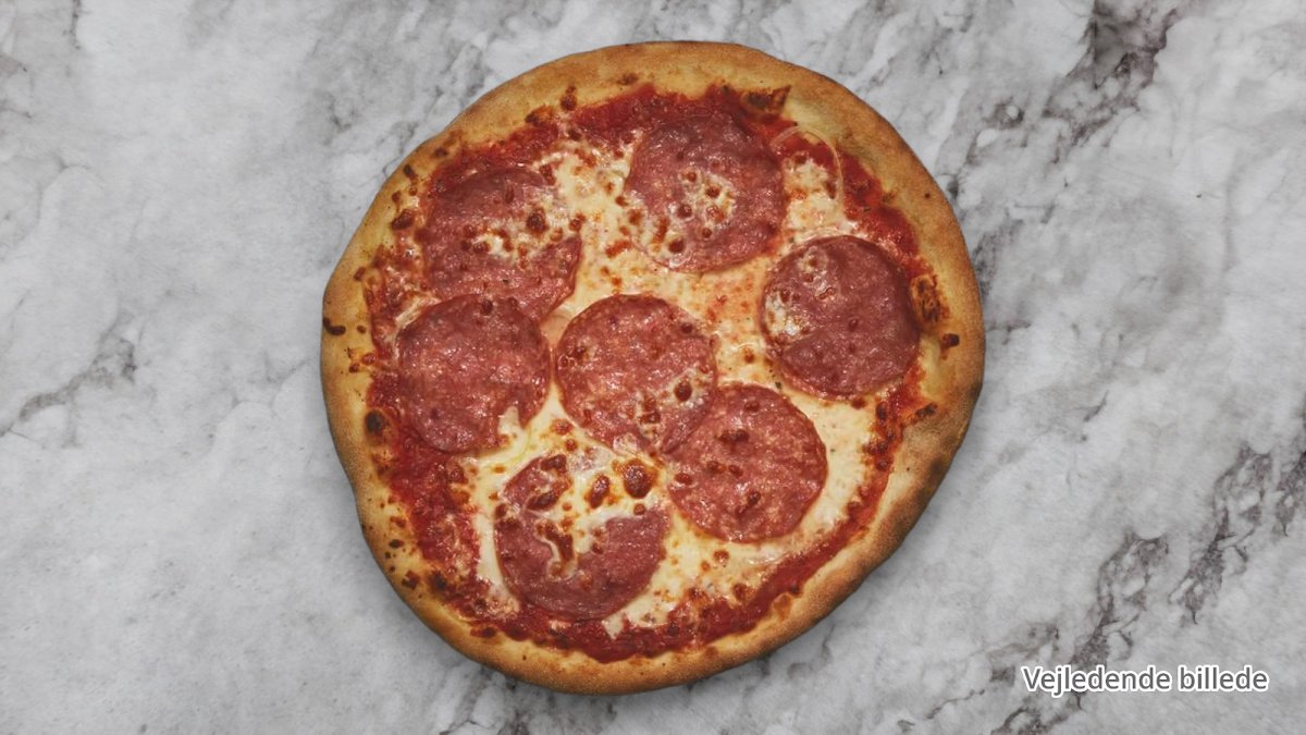 Tomatsauce, ost, oregano, pepperoni, champignon og peberfrugt.