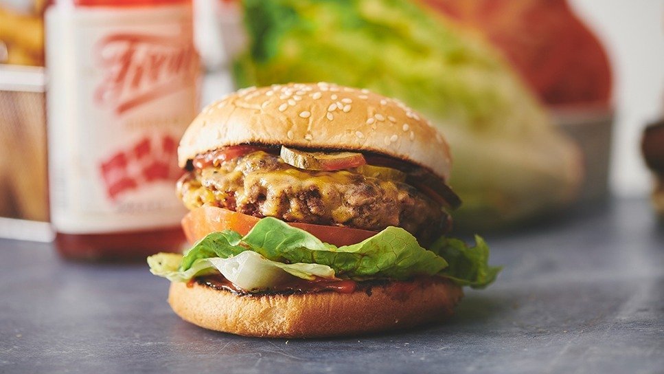 Burgerbolle med fyld af oksebøf, ost, bacon, salat, tomat, agurk, bacon, løg og burgerdressing.