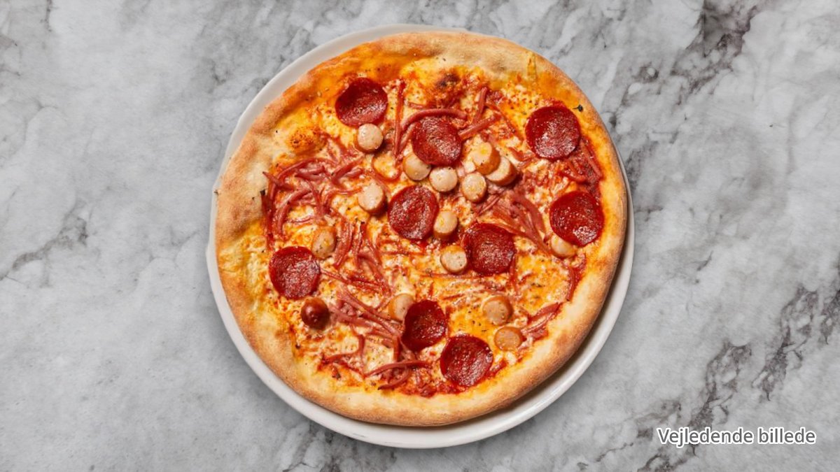 Tomatsauce, ost, oregano, skinke, kebab, pepperoni og pølser.