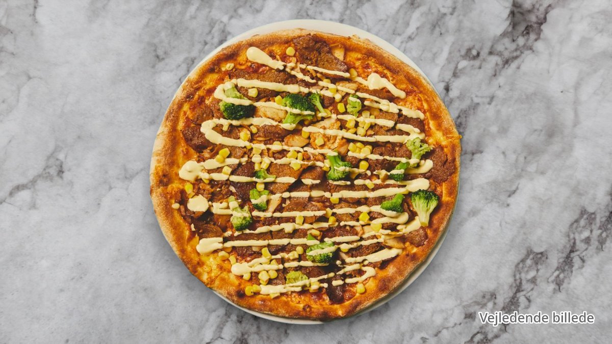 Tomatsauce, ost, oregano, pepperoni, kebab, kylling og hollandaisesauce.
