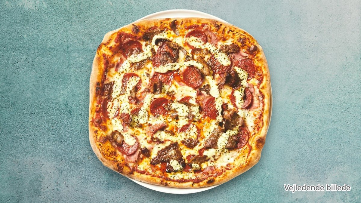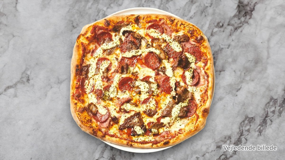 Tomatsauce, ost, oregano, skinke, oksekød, pepperoni og kebab.