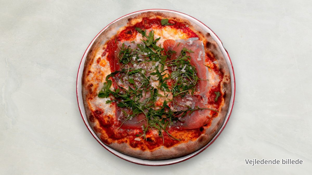 Tomatsauce, ost, oregano, skinke og pepperoni.