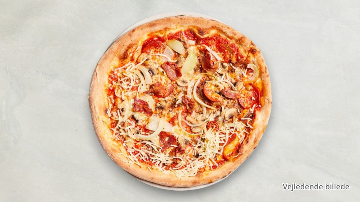 Tomatsauce, ost, oregano, pepperoni, kylling, kebab og bacon.
