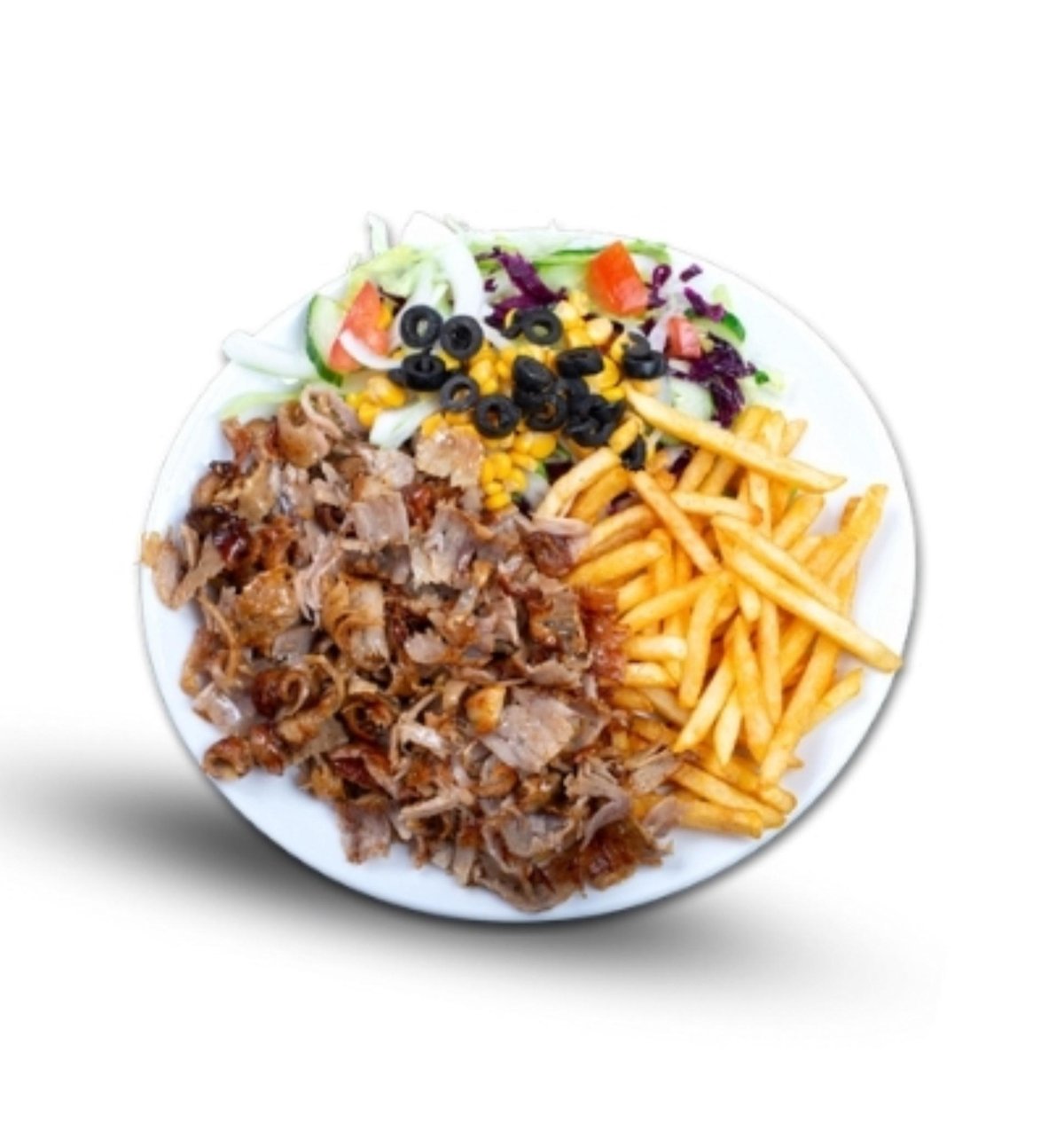Dönerkebab, pommes frites, salat tomat, agurk, løg, majs, oliven og dressing.