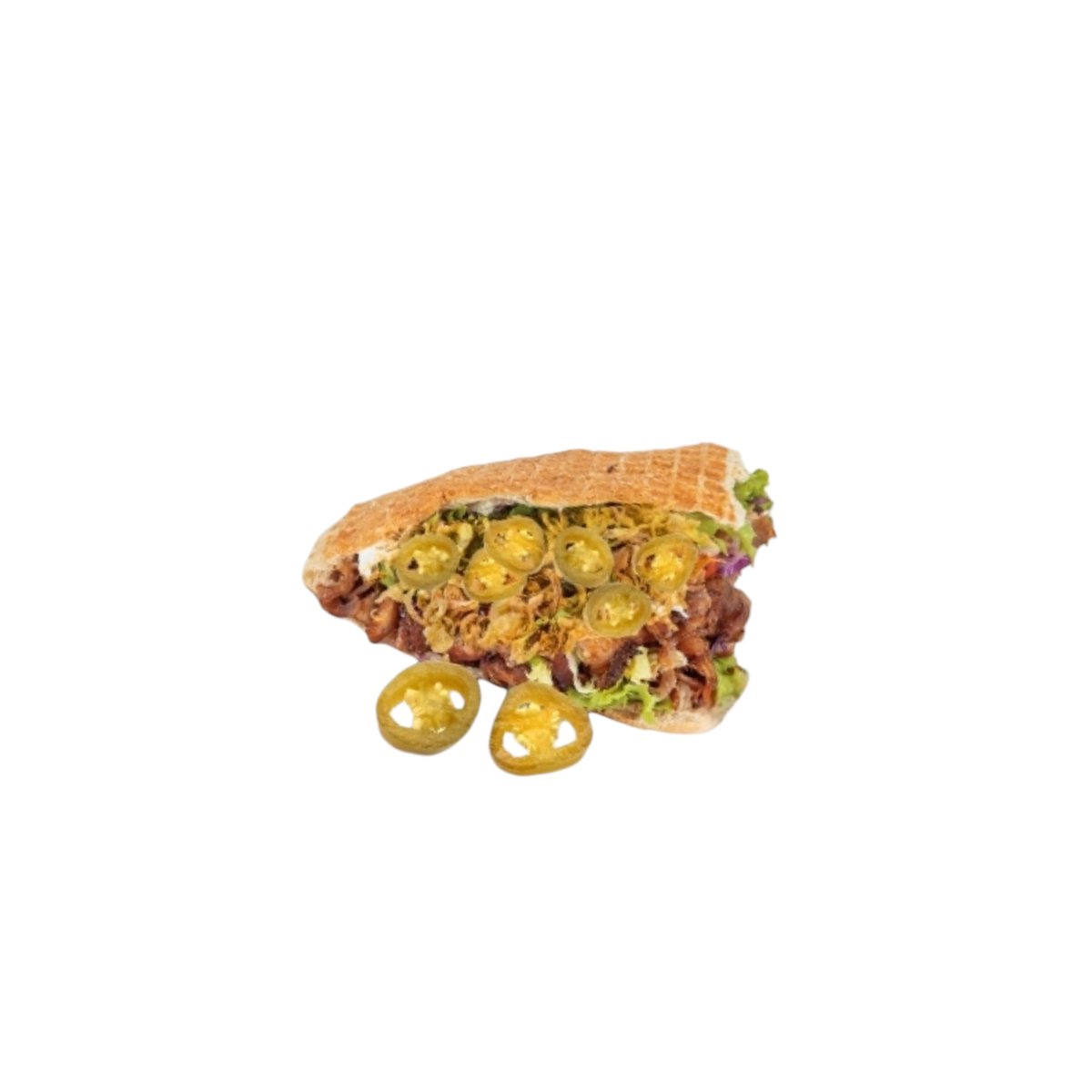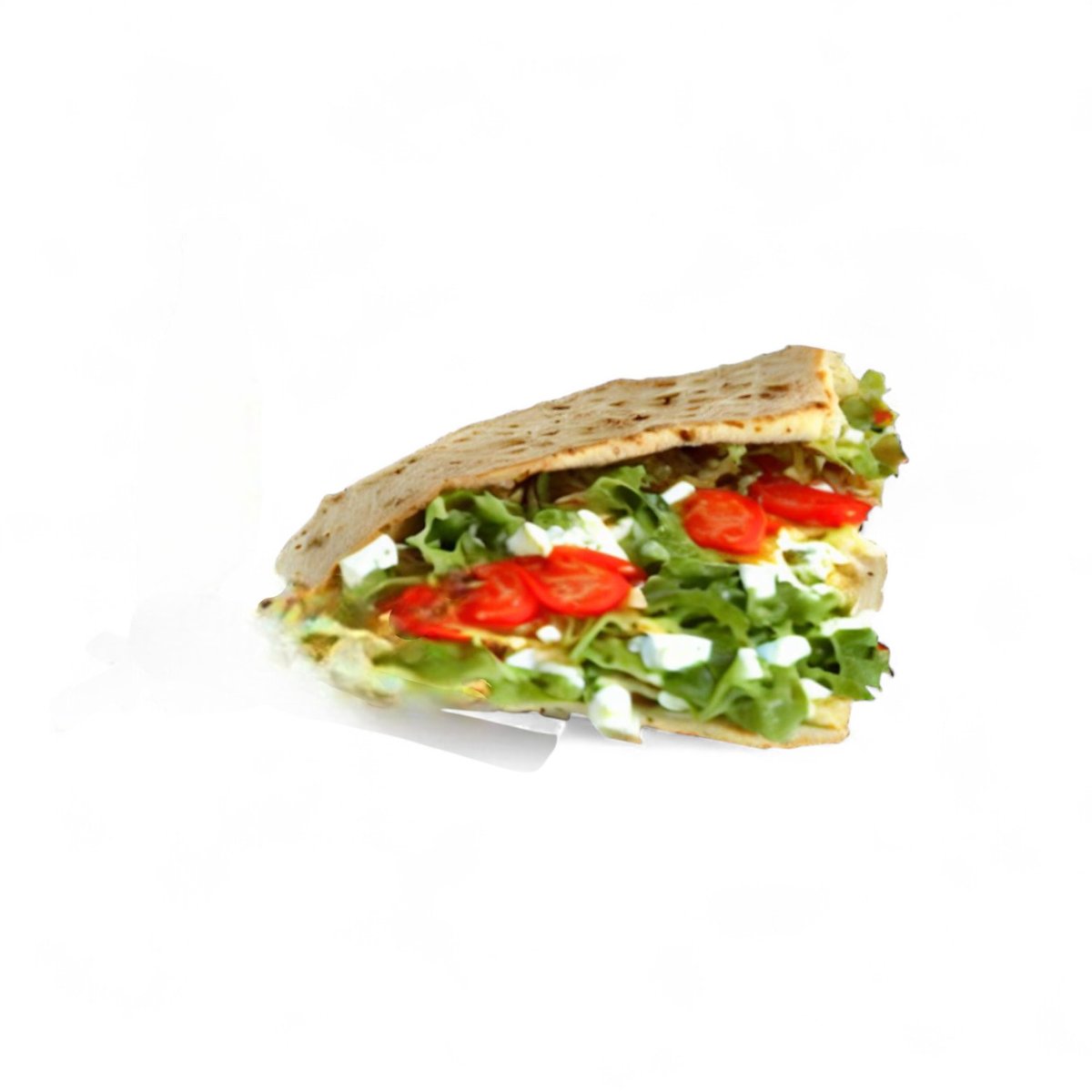 Fladbrød med fyld af valgfri protein, salat, tomat, agurk, rødløg, marineret rødkål, hvidkål, thousand island dressing og tzatziki.