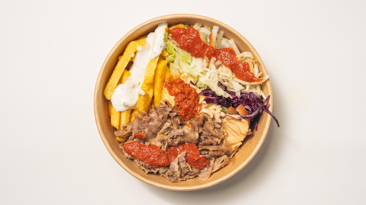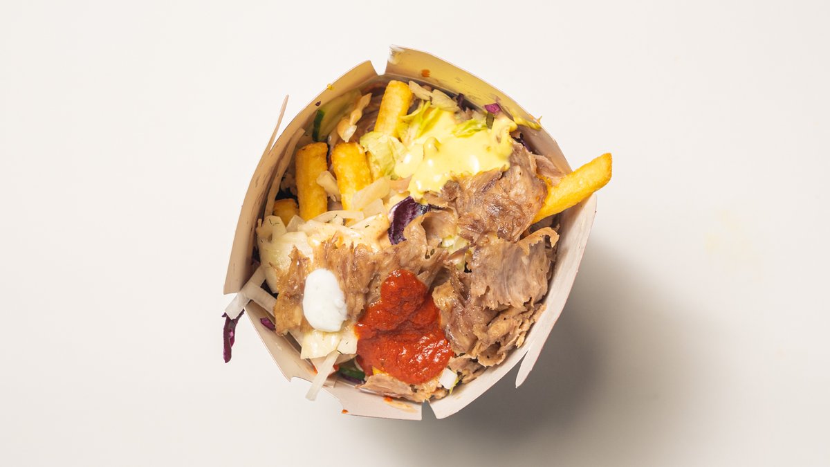 Box med fyld af valgfri protein, pommes frites, agurk, hvidkål, løg, rødkål, salat, tomat, tzatziki, hjemmelavet safran-sauce, hjemmelavet tomatsauce og hjemmelavet cocktail-dressing