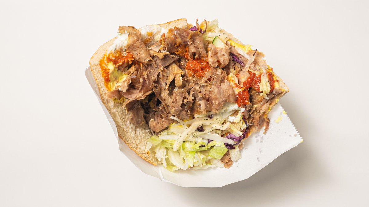 Fladbrød med sesam fyld af valgfri protein, agurk, hvidkål, løg, rødkål, salat, tomat, tzatziki, hjemmelavet safran-sauce, hjemmelavet tomatsauce og hjemmelavet cocktail-dressing. Serveres med pommes frites og valgfri sodavand.
