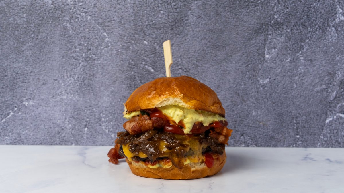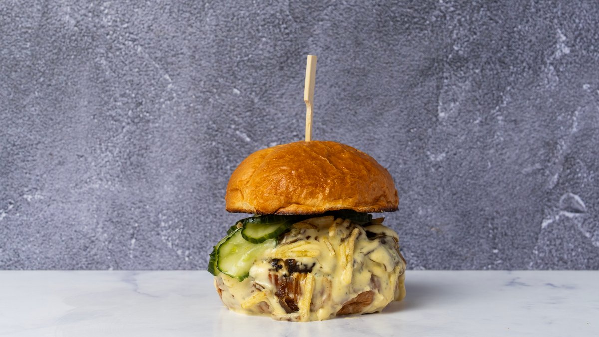 Traditionel bøfsandwich opdateret med cheddarost, bacon, ketchup, sennep, remoulade og agurkesalat. Derudover løg med valgfri tilberedning. Serveres med pommes frites og dip.