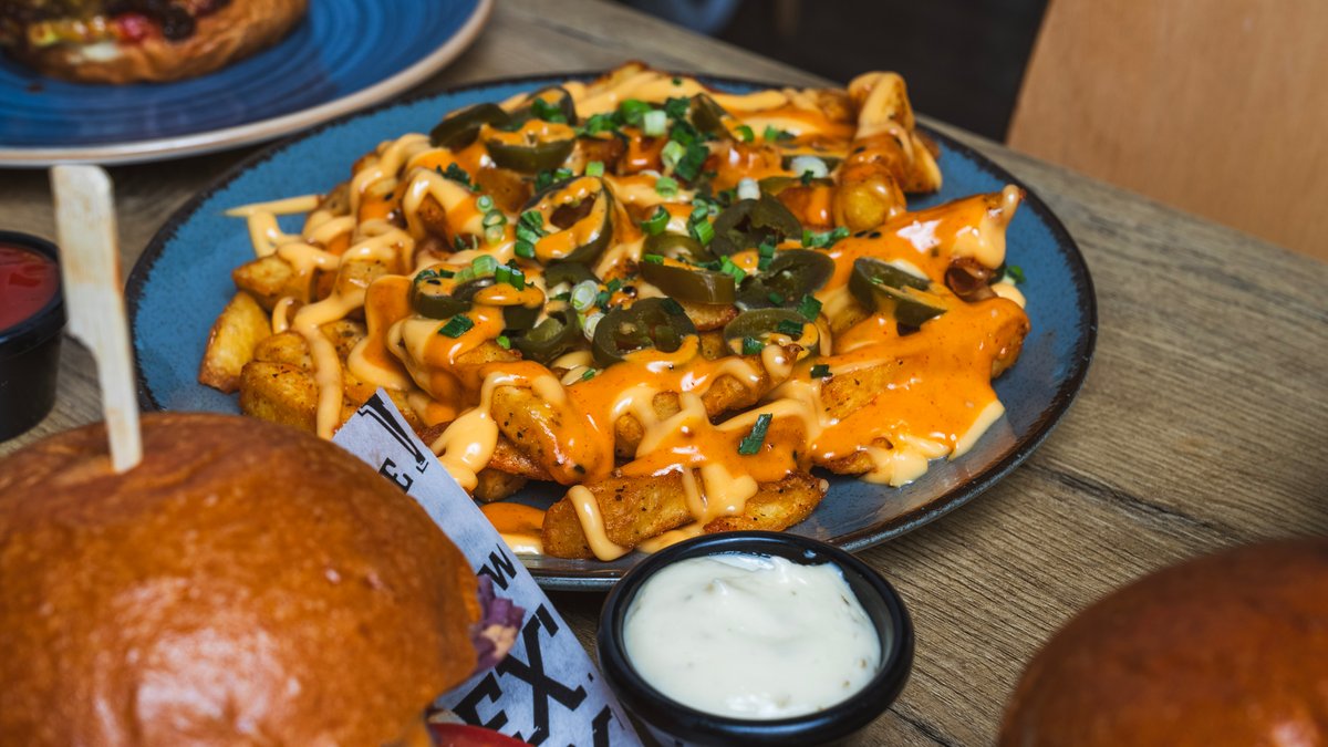 Chese fries med oksekød, toppes med hyttens dressing, cheesesovs, jalapenos og forårsløg.