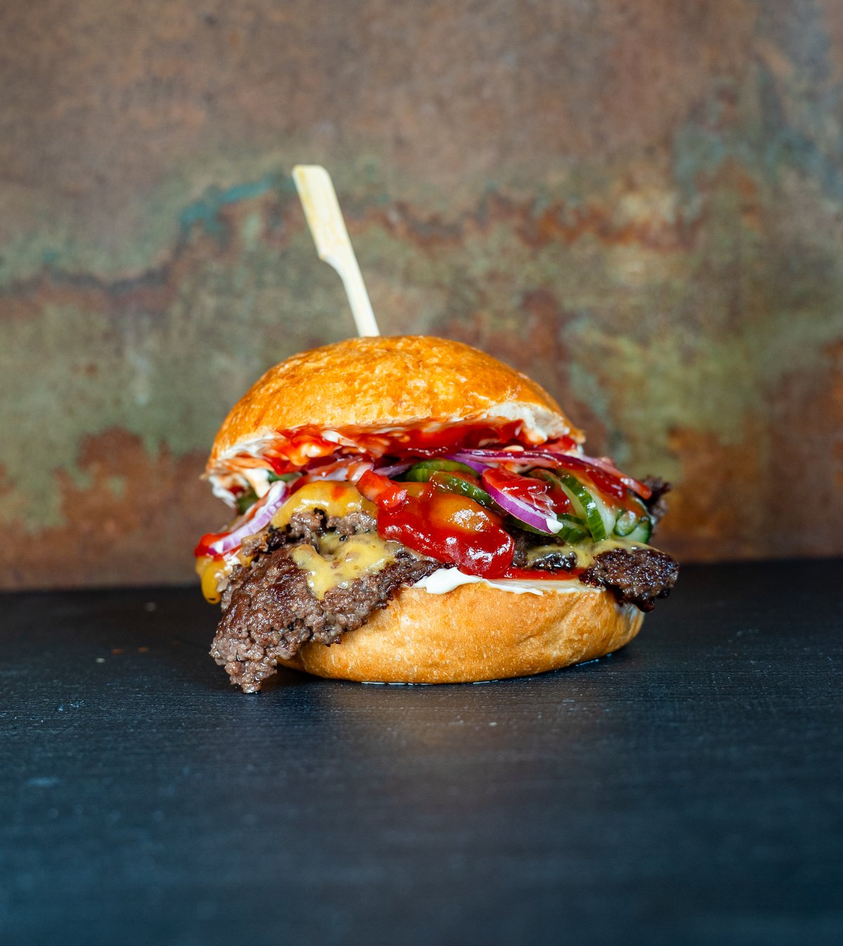 Brioche burgerboller med valgfrit protein, røget bacon, cheddarost, ketchup, sennep, remoulade, hjemmesyltet agurkesalat og valgfrit topping.