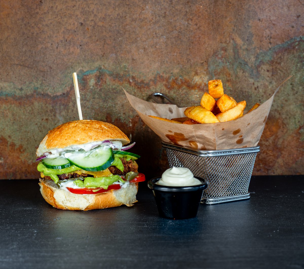 Cheddarost, icebergsalat, tomat, hjemmesyltet agurkesalat, rødløg og chilimayo. Serveres med pommes frites og dip.