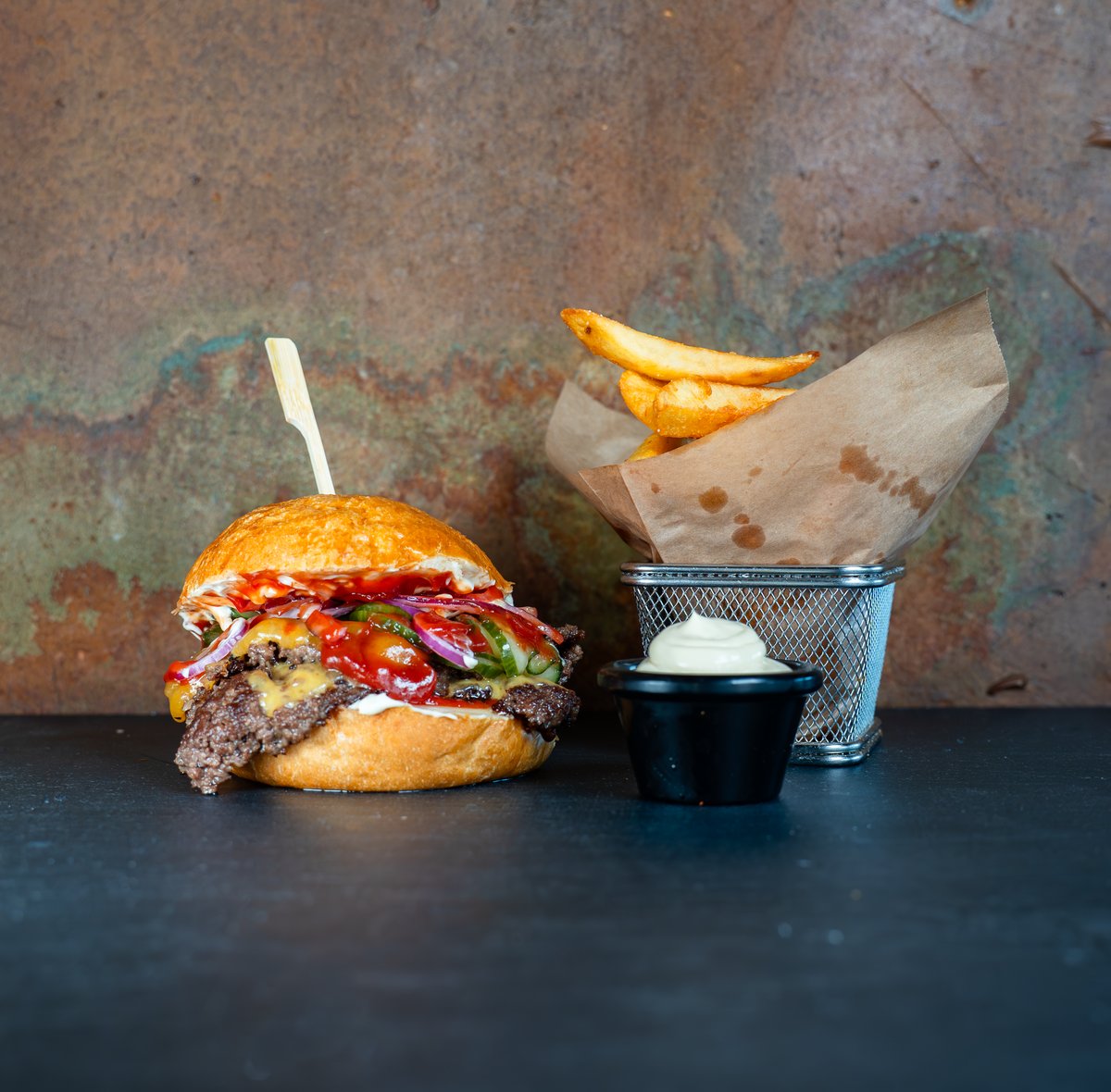 Vælg mellem single eller dobbelt bøf. Serveres med pommes frites og dip.