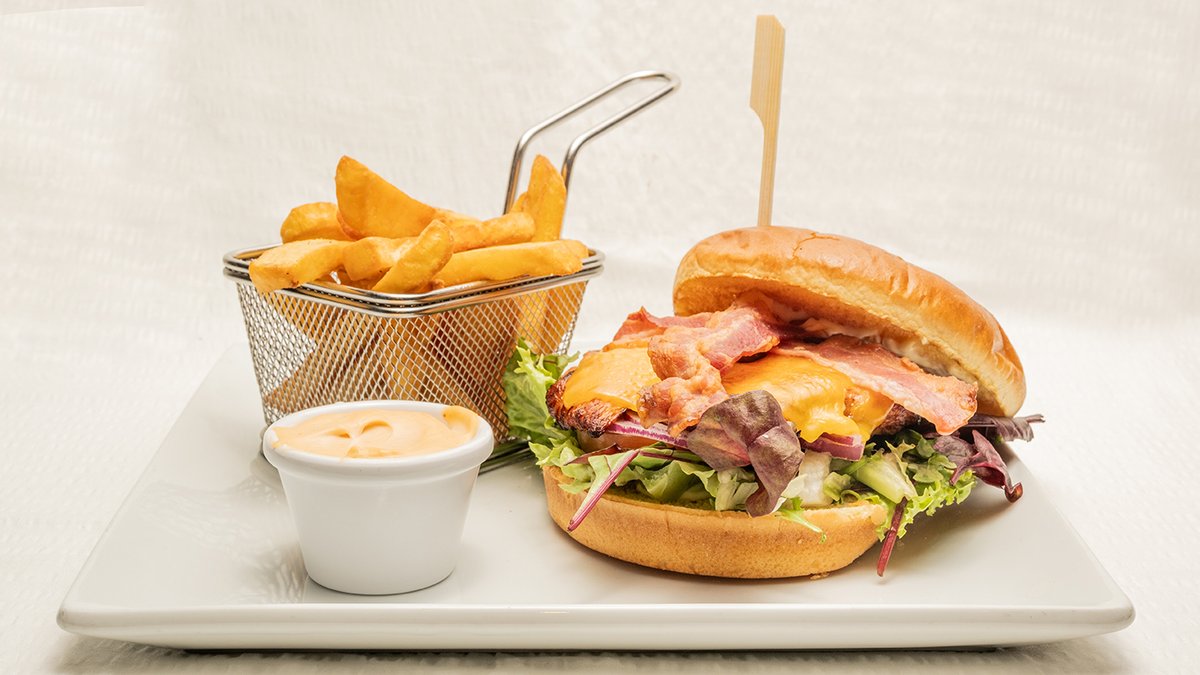 Burgerbolle med fyld af 200 gram grillet hakkebøf, sprød bacon, ost, blandet salat, agurk, tomat, rødløg og bearnaisesauce. Serveres med valgfrie kartofler og chilimayo.