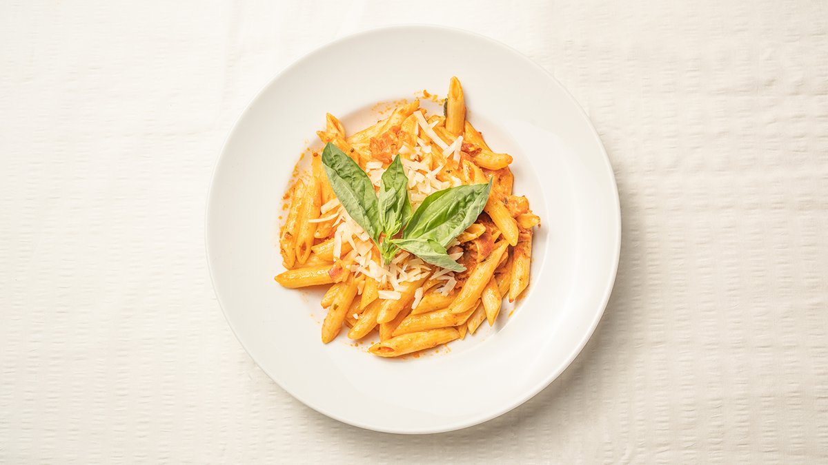 Penne pasta vendt i tomatsauce med bacon, chili og hvidløg.