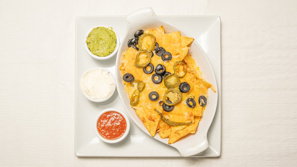 Tortillachips toppet med cheddar, oliven og jalapeños. Serveres med salsa, guacamole og creme fraiche.