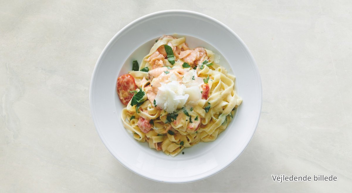 Spaghetti vendt i tomat- og flødesauce med laks og rejer.