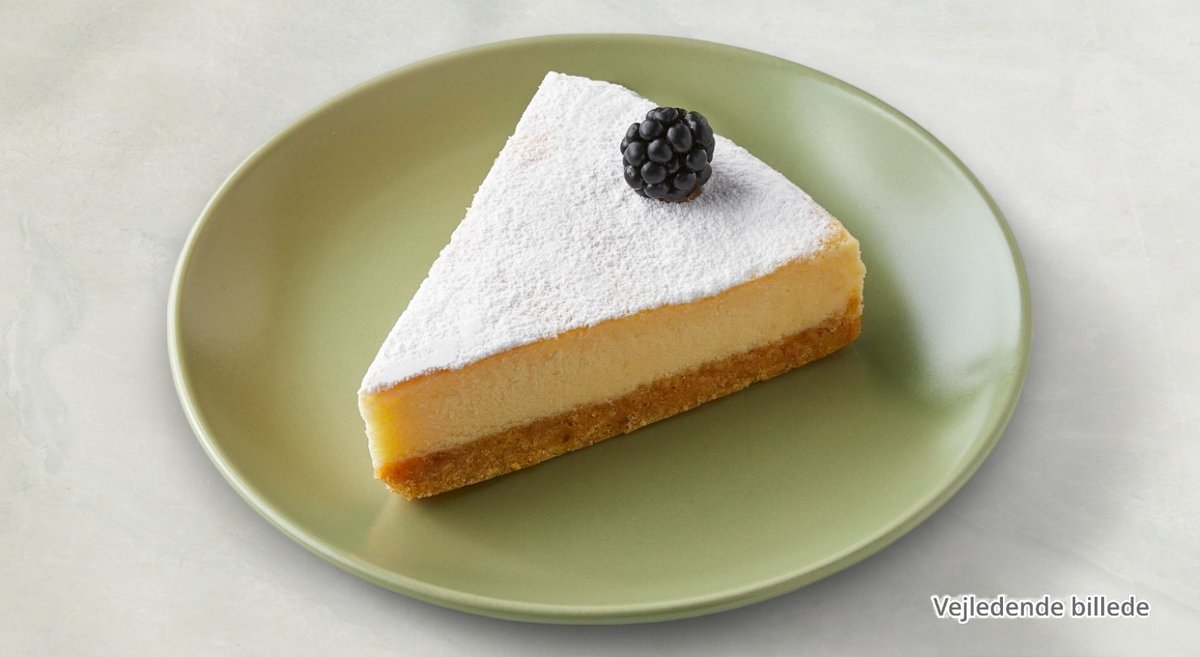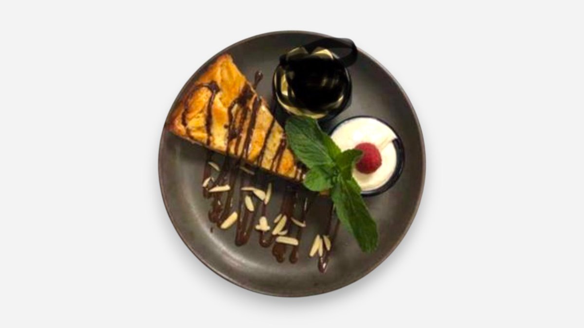 Lun æblekage serveret med creme fraiche og chokoladesauce.