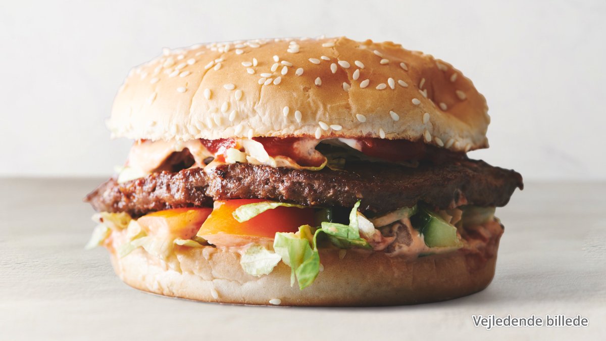 Burgerbolle med fyld af dobbel grillet hakkebøf, bacon, ost, blandet salat, agurk, tomat, rødløg og burgerdressing. Serveres med valgfrie kartofler og chilimayo.