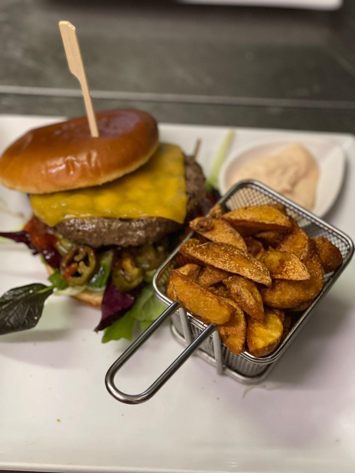 Burgerbolle med fyld af spicy grillet hakkebøf, ost, jalapeños, guacamole, salsa sauce, blandet salat, agurk, tomat og rødløg. Serveres med valgfrie kartofler og chilimayo.