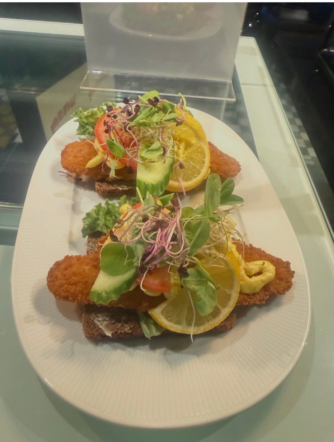 Brød toppet med fiskefilet, salatblad, remoulade og citron.