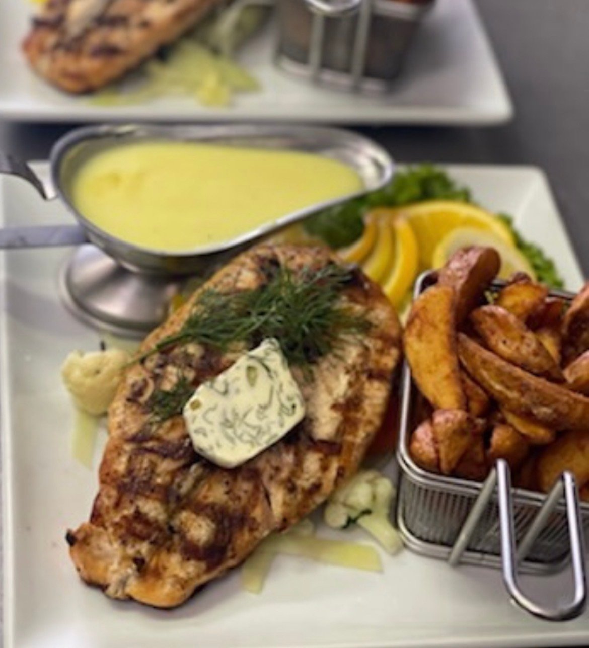 Laksefilet let tilberedt på vores grill serveret med garniture, hvidvinssauce og valgfrie kartofler.