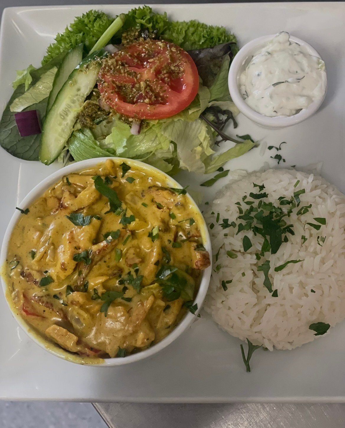 Kyllingegryde med peberfrugt, løg og flødesauce. Serveres med ris og tzatziki, salat, tomat, agurk og løg.
