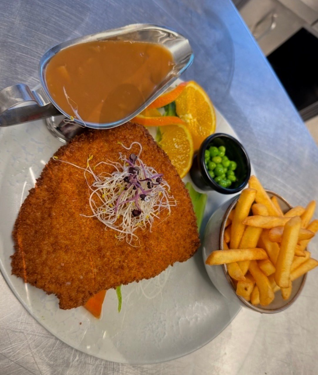 Schnitzel af svinekød serveret med garniture, valgfrie kartofler og valgfri sauce.