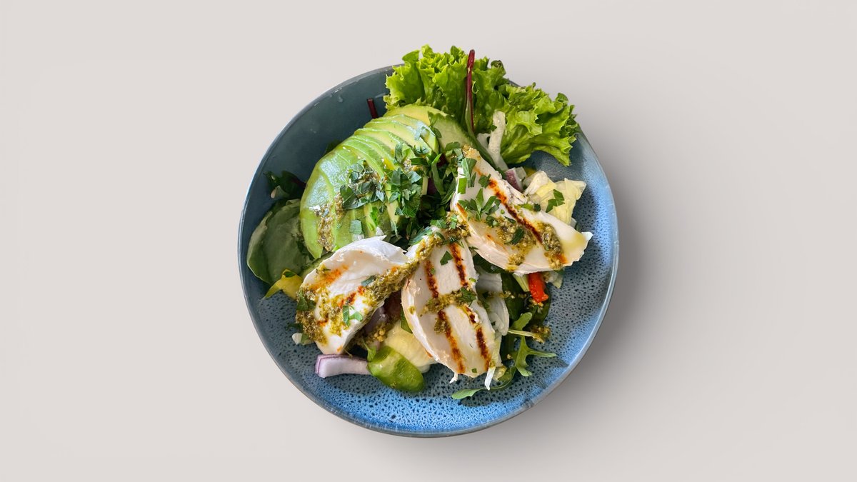 Blandet salat med crispy chicken, avocado, tomater, agurk, rødløg, og pestodressing.