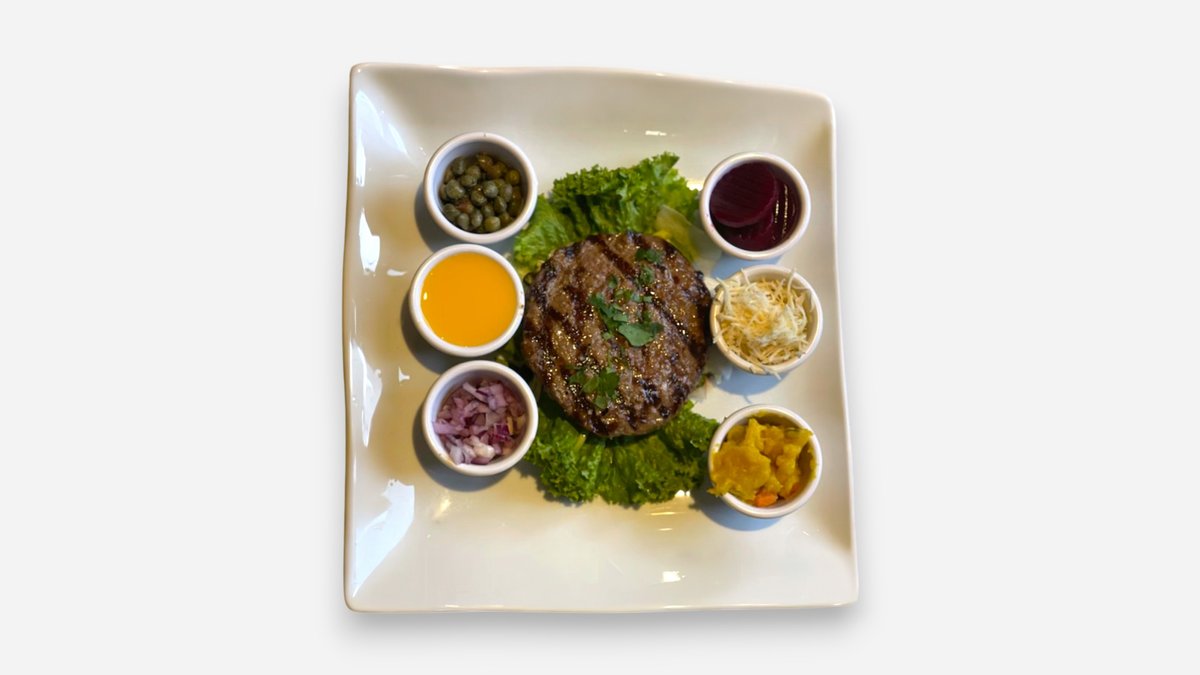 Hakket oksebøf serveret med blandet salat, rødbeder, æggeblomme, kapers, løg, peberrod, pickles, tomat og agurk.