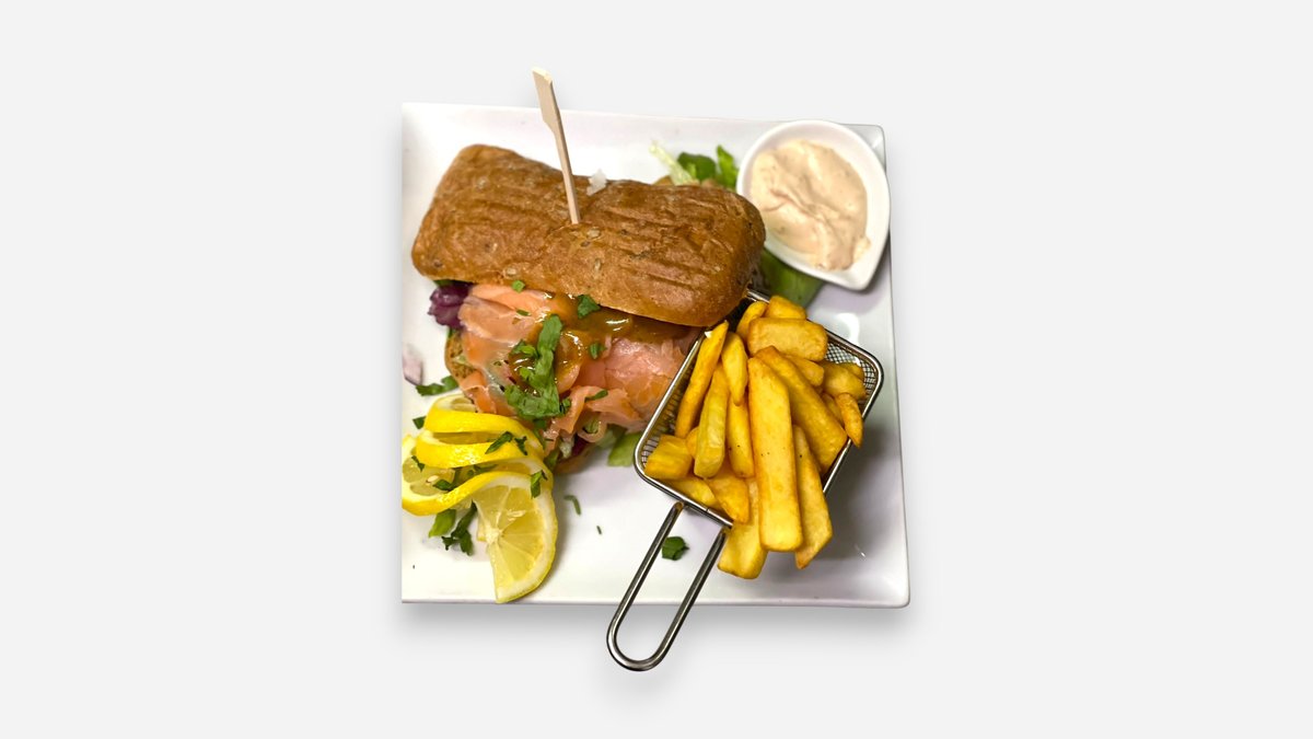 Italiensk brød med fyld af røget laks, blandet salat, tomat, agurk, rødløg og dildressing. Serveres med valgfrie kartofler og chilimayo.