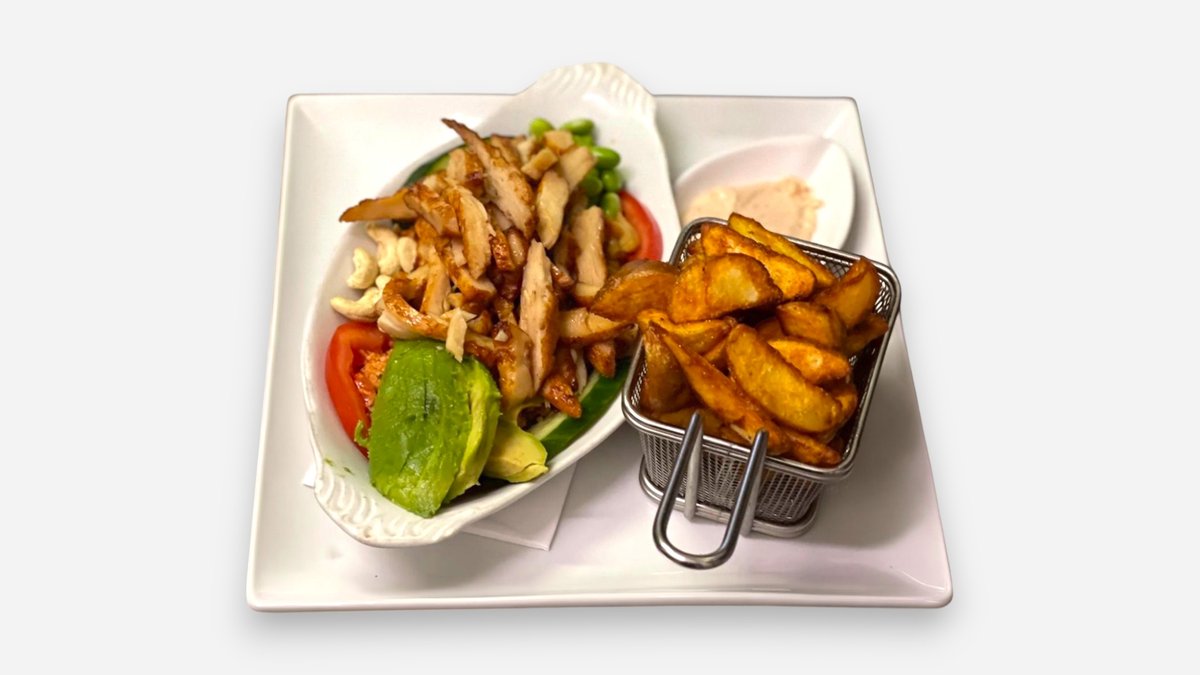 Bowl med hjemmelavet couscous, honningmarineret kylling, edamammebønner, syltede rødløg, avocado, tomat, agurk og cashewnødder. Serveres med valgfrie kartofler og chilimayo.