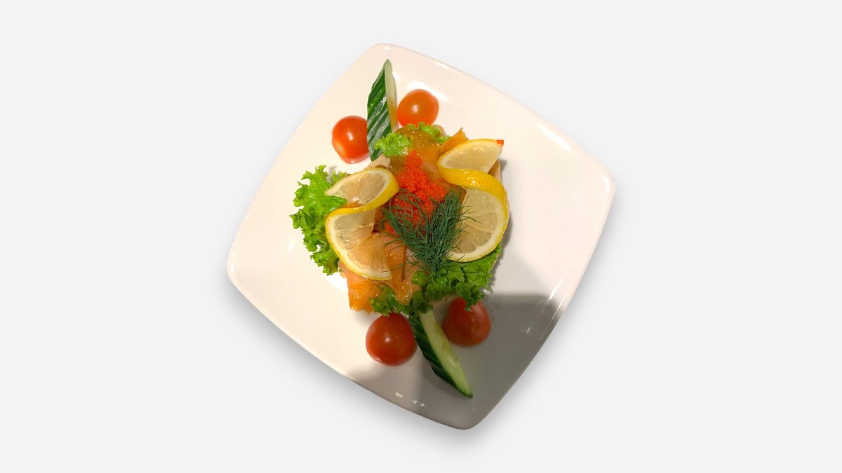 Blandet salat, røget laks, agurk, tomat, avocado, rødløg, citron og dild dressing.