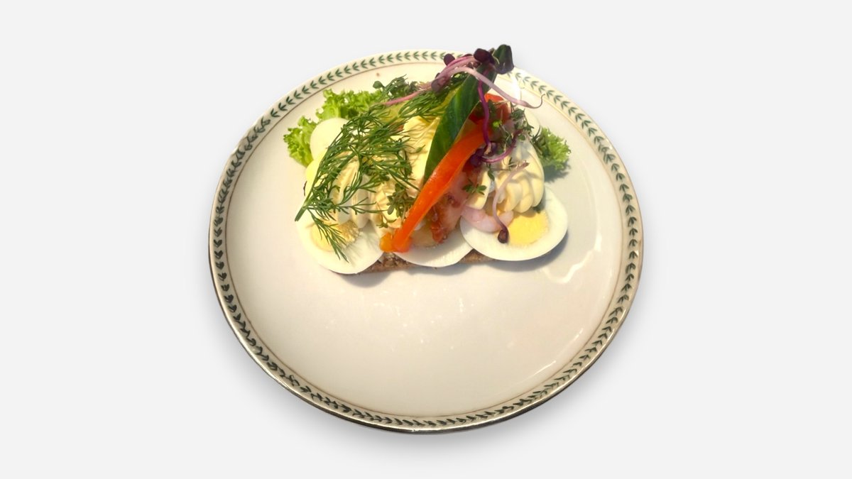 Brød toppet med salatblad, hønsesalat, syltede rødløg og bacon.