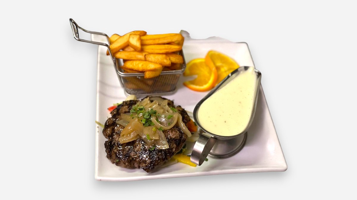 200 g hakket oksekød Serveres med bløde løg, garniture, pommes frites eller vildmose kartoffeler. Vælg mellem bearnaise, pebersauce eller champignonsauce