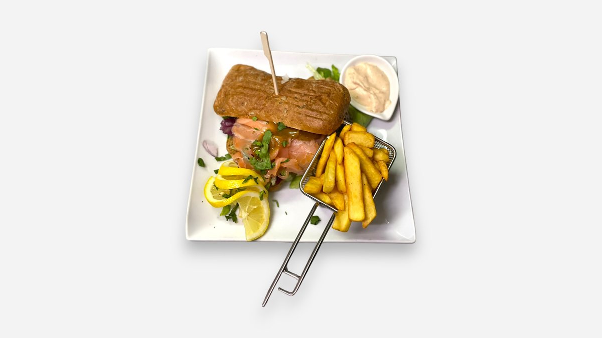 Italiensk brød med fyld af røget laks, blandet salat, tomat, agurk, rødløg, og dilddressing. Serveres med valgfrie kartofler og chilimayo.