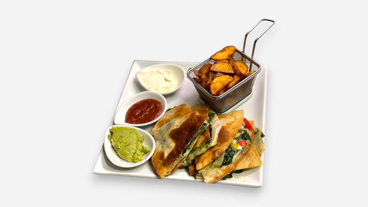 Tortilla pandekage med fyld af gedeost, karameliserede, løg, spinat, cheddar og peberfrugt. Serveres med valgfrie kartofler, guacamole, salsa og cremefraiche.